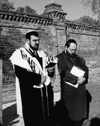 Pražský rabín Jehuda Jesharim a předseda ŽO v Lodži Symcha Keller při modlitbě za zemřelé.